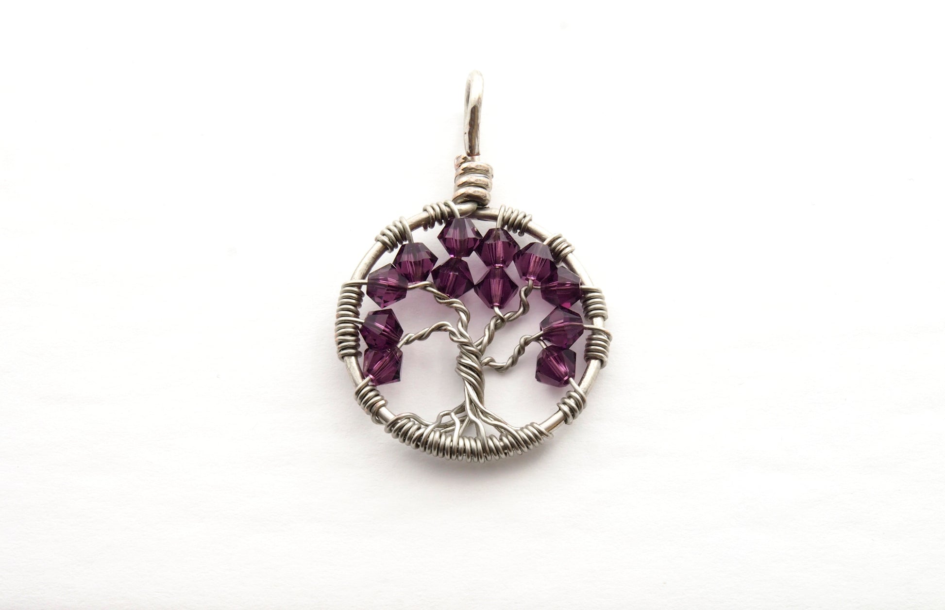 A handmade wire wrapped tree of life necklace beaded with 12 dazzling Swarovski® crystals in Amethyst. You can choose between sterling silver or copper wire for your pendant.